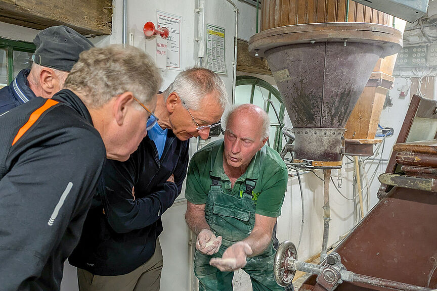 Hier erwarteten uns schon der Senior-Müllermeister Herr Dobelke und Frau Ritter. In drei Gruppen konnten wir die Mühle in vollem Betrieb besichtigen – Herr Dobelke erklärte die die einzelnen Mahlschritte. Es war sehr eng und sehr laut in der Mühle, und es war beeindruckend, die vielen Mahlwerke, Rüttelsiebe und unzähligen Transportrohre in Aktion zu erleben.