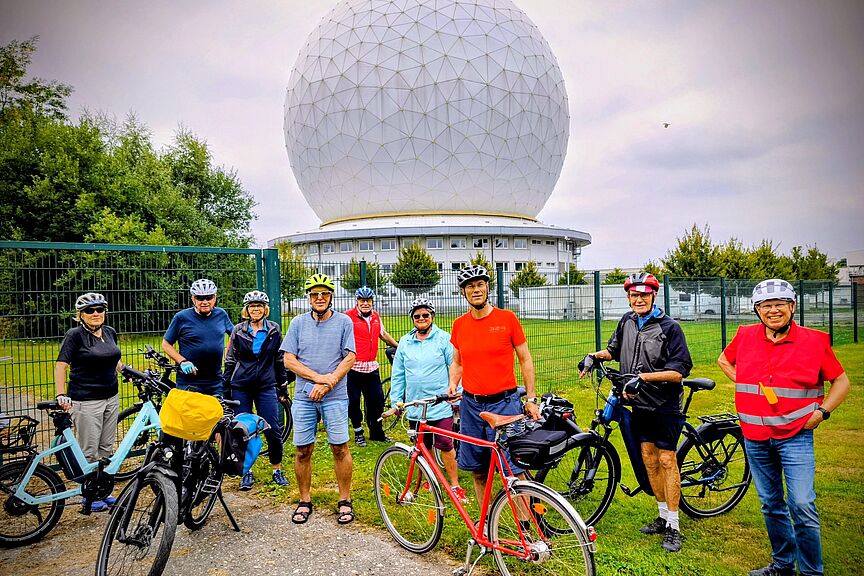 Vorbei an der Deponie führte die Route nach Niederpleis. Der ehemaligen Bröhlbahn Trasse, dem jetzigen Bröhltal Radweg, sowie dem neuen Radweg entlang der B56 folgend erreichten wir am alten Beueler Bahnhof den Rhein. Weiter ging es durch die Rheinaue zur Südbrücke wo wir auf die linke Fluss Seite gewechselt sind. Auf gut beschilderten Fahrradstraßen radelten wir in Richtung Bad Godesberg. Wechselten kurz auf den Fernradweg am Rheinufer bis Bonn Mehlem. Rechts ab ging es von Mehlem hoch nach Wachtberg vorbei an Niederbachem. Auf der Apfelroute radelten wir durch Züllig Hoven bis Werthhoven. Ein kurzer Foto Stopp an der Weltraumbeobachtungsstation, die wir anschließend umrundeten, um an einen Aussichtspunkt in Berkum zu gelangen. Hier hatten wir einen märchenhaften Ausblick auf den Petersberg, die Drachenburg und den Drachenfels.
